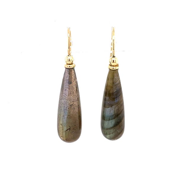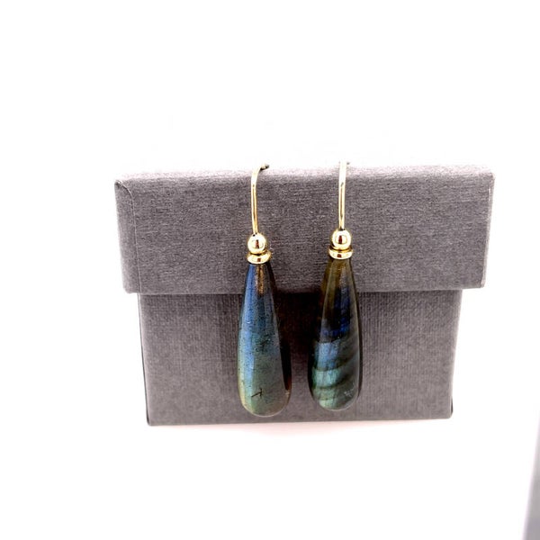 Oorbellen met labradorieten 'drops' of te wel druppels aan 14 karaat gouden haken, prima elke dag te dragen. Lengte van de labrodorieten kralen is 23x8 mm.