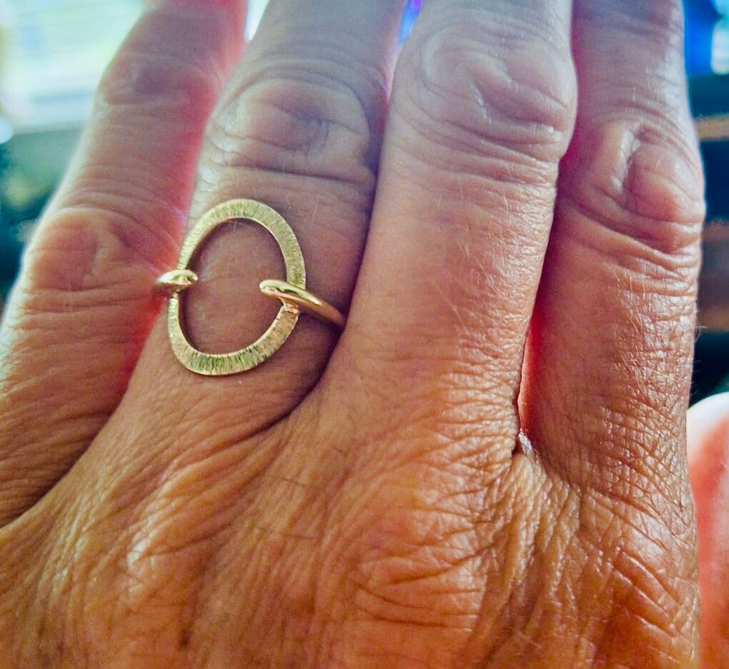 Voor haar pensionering mocht ze een ring uitzoeken. Het werd een fijne klassieke ring met twee bandjes bezet met tien diamanten, met een kleine verwijzing naar een double helix die in het logo van het bedrijf verwerkt zit.