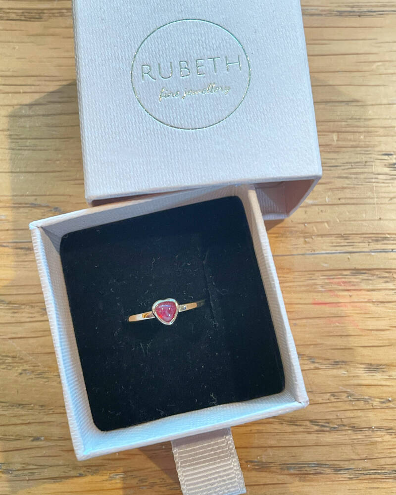 Voor haar 21ste verjaardag maakten we een ring van oud goud van haar moeder met een roze tourmalijnen hartje.