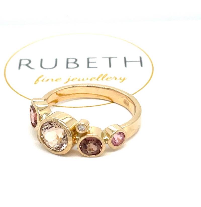 Eerder maakten we al van oude sieraden een ring met roze en paarse saffieren. Van het goud dat over was hebben we nu een solitair ring gemaakt, bijpassend bij de ring met saffieren, in poeder roze kleuren. De grotere middensteen in een zacht roze morganiet, eromheen twee diamantjes, die haarzelf en haar twee zonen symboliseren. De andere stenen zijn saffier en toermalijn.