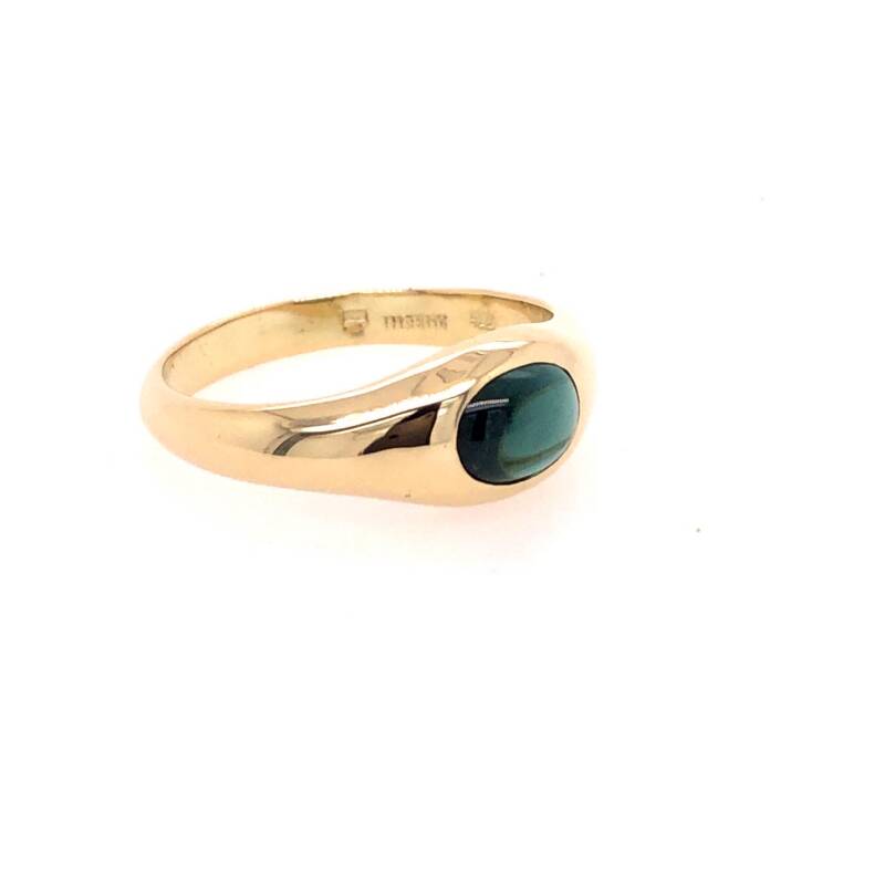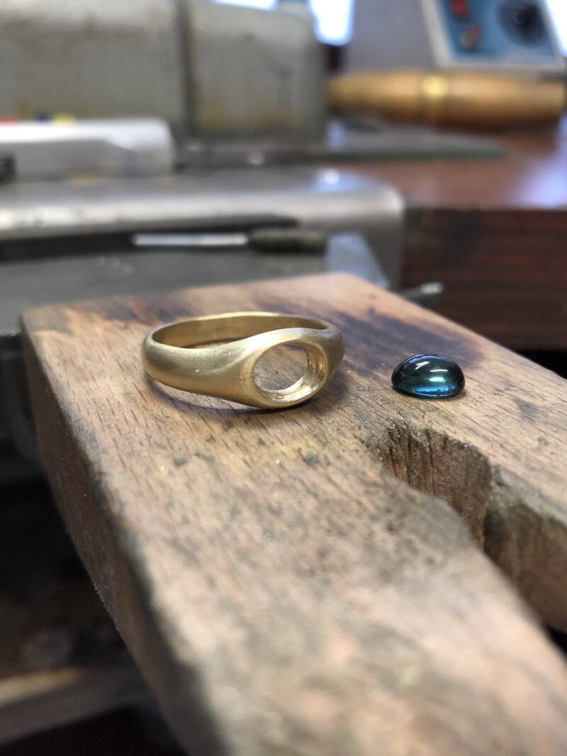 Voor haar verjaardag mocht ze een ring laten maken. Het werd een stoere maar prachtige ring met een groene toermalijn, cabochon geslepen, die mooi in de ring is gezet. De ring is gemaakt als wasmodel en later in goud gegoten. Gefeliciteerd Esther!