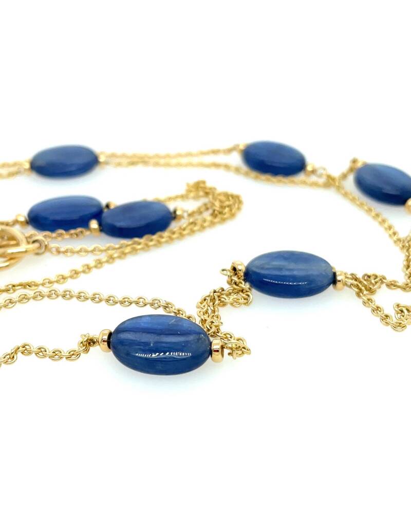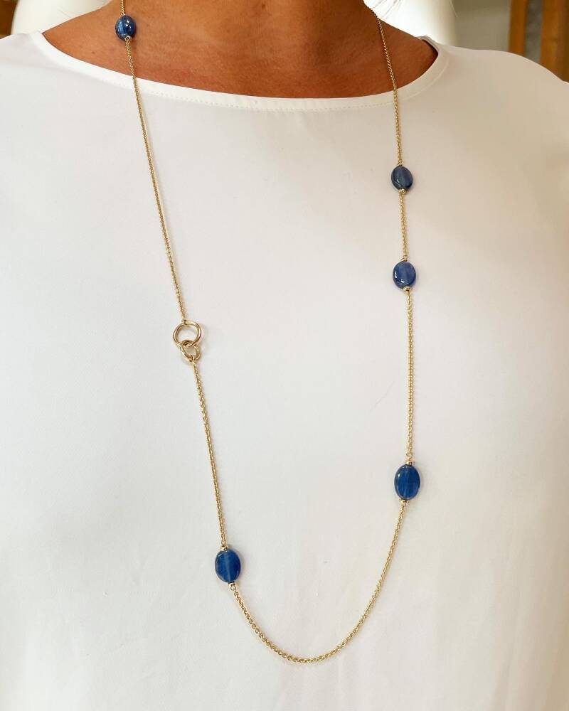 Voor haar verjaardag maakten we een lang 14 karaat gouden anker collier met tussenstukje met ogen en Kyaniet edelstenen kralen. Het collier is zo lang dat het over het hoofd omgedaan kan worden.
