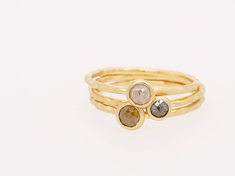 Van de trouwring van haar vader maakten we 3 ringen met 'salt & pepper' diamanten. De ringen zijn gehamerd en licht gematteerd. Ze kunnen samen of apart worden gedragen.