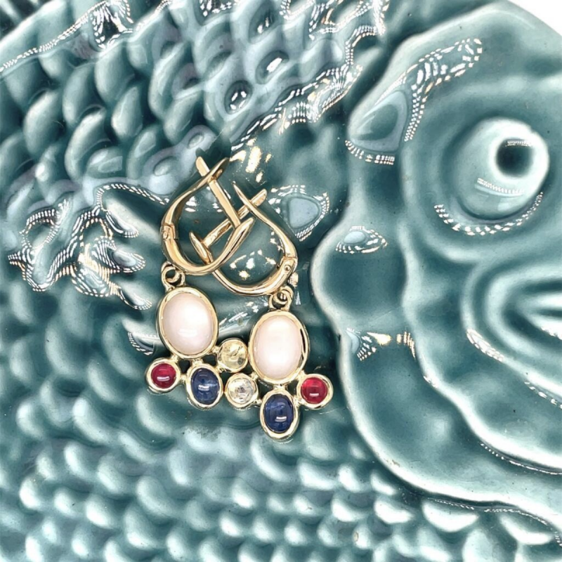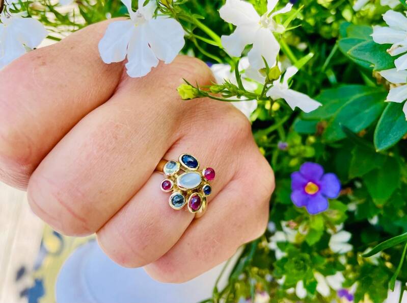 Bij haar oorbellen maakten we een bijpassende ring, ook weer met een maansteen, aquamarijn, robijn en blauwe saffier
