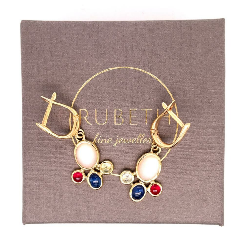 Voor haar 25 jarige huwelijk mocht Maaike een sieraad laten maken. Het werden prachtige oorbellen met de geboortestenen van haar man, twee zonen en van haar zelf! Met saffier, robijn, aquamarijn en maansteen.